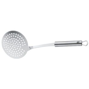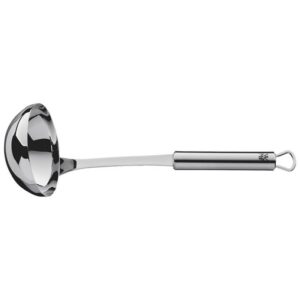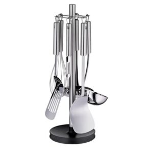 Idealno rešenje za kuhinjski alat, WMF Profi Plus set kuhinjskog pribora, pojednostavljuje vreme provedeno u kuhinji. Set od 7 delova uključuje praktičan stalak koji štedi prostor i koji sve drži pri ruci: kutlaču za prelivanje, kutlaču za skidanje pene, špatulu, špatulu za vok, mutilicu i ljuštilicu za povrće. Napravljeni od zapanjujućeg Cromargan®-a, ovi izuzetno izdržljivi pribor imaju praktičnu rupicu za kačenje, kao i dizajn koji se može prati u mašini za sudove za lako čišćenje i savršenu higijenu. Zapanjujuća, ali praktična Profi Plus serija kuhinjskog pribora radi sve. Od stilskog pribora za serviranje do praktičnih alata za pripremu, čak i najteži zadaci postaju bez napora. Kombinacijom vrhunskih, vodootpornih materijala sa bezvremenskom estetikom i dugotrajnom konstrukcijom, Profi Plus je savršen kulinarski asortiman.